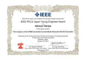 Mr. Akinori Hariya was awarded the 2014 IEEE PELS Japan Chapter Young Engineer Award.